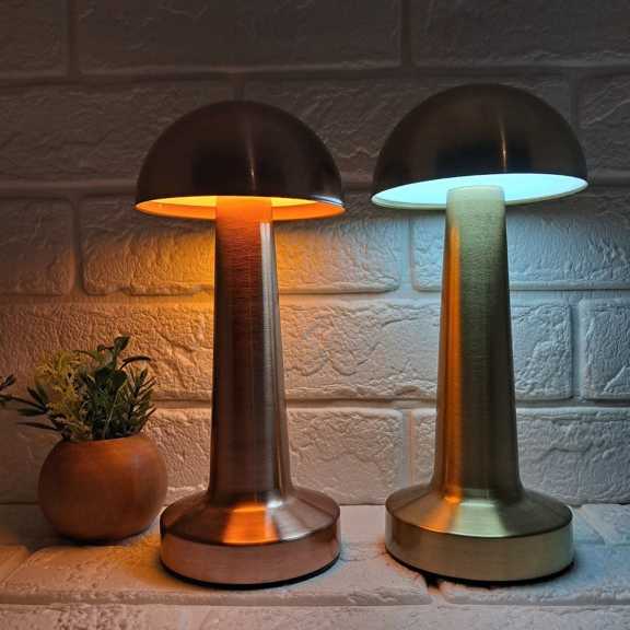 آباژور رومیزی شارژی مدل قارچی با طراحی مدرن و مینیمال، یک انتخاب ایده‌آل برای نورپردازی فضای کار، مطالعه و دکوراسیون منزل شما است. این آباژور با بدنه‌ای از جنس آلومینیوم با کیفیت و مقاوم، هم ظاهر شیک و لوکس دارد و هم دوام بالایی ارائه می‌دهد. امکان استفاده از این محصول به صورت شارژی باعث می‌شود که بدون نیاز به سیم و پریز برق، بتوانید آن را در هر نقطه‌ای از خانه یا محل کار خود قرار دهید.